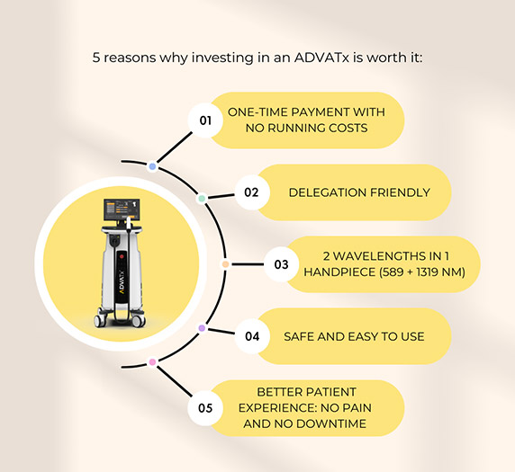 Off the table results... without numbing or down time. Combining the gold standard wavelength for eliminating vascular abnormalities with the new gold standard for non-ablative resurfacing, the ADVATx allows the provider to treat 25 FDA/CE cleared indications without the use of consumables.